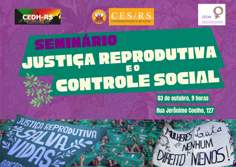 O Conselho Estadual do Rio Grande do Sul (CES/RS), em parceria com o Conselho Estadual de Direitos Humanos e o Conselho Estadual de Direitos da Mulher, realizará o Seminário Justiça Reprodutiva e Controle Social no dia 03 de outubro de 2024.